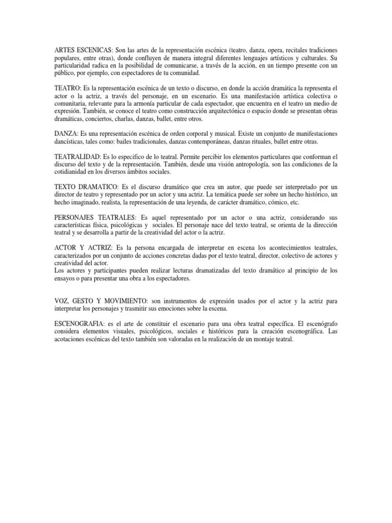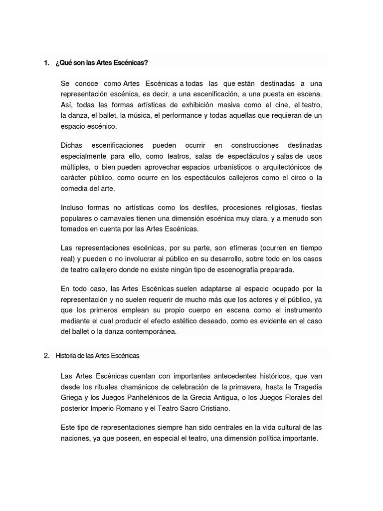 Artes escénicas.creaciones donde el ejecutante es parte de la obra... 1 aunque son fundamentalmente tres disciplinas artísticas las que son representadas en las artes escénicas (teatro, danza y música) estas a su vez se subdividen o se conjugan en otras tantas, como por ejemplo la ópera, la zarzuela, el teatro musical, el performance, el cabaret. Artes escénicas.creaciones donde el ejecutante es parte de la obra. Otro ejemplo sería la descripción de un producto alimenticio, como un refresco embotellado, para publicitarlo y ponerlo en el mercado. Las artes escénicas son aquellas manifestaciones artísticas creadas para ser representadas sobre un escenario... Artes escénicas.creaciones donde el ejecutante es parte de la obra.